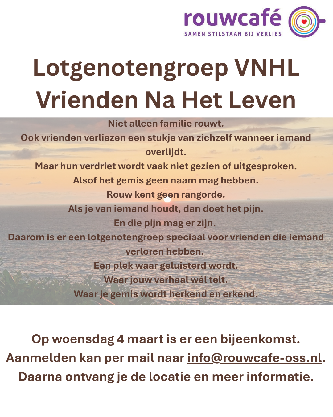 info@rouwcafe-oss.nl. Jeanette zal daarop verdere uitleg geven en de plaats van samenkomst bekend maken.